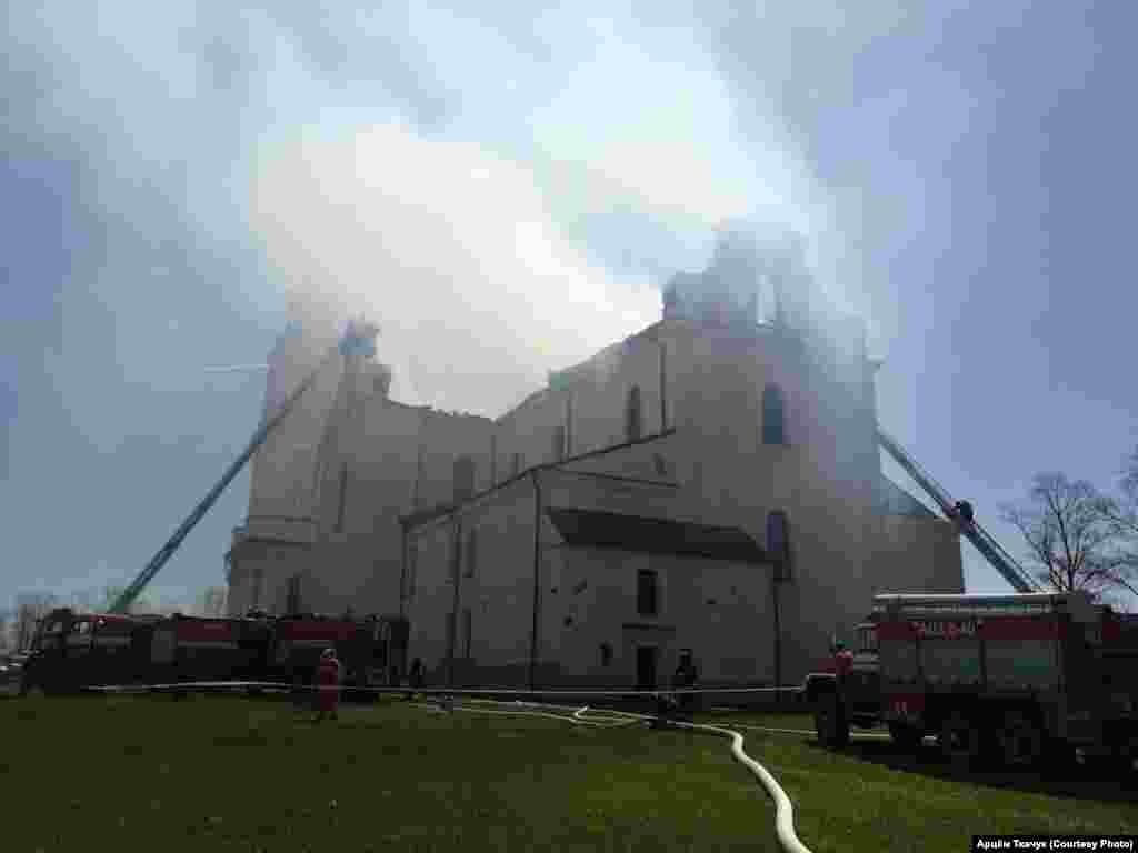 Раніцай 11 траўня загарэўся дах у Нацыянальным Санктуары – касьцёле Маці Божай Будслаўскай. Каля 10-й гадзіны дах над цэнтральнай навай касьцёла быў цалкам зьнішчаны агнём і абрынуўся. Каля 11-й гадзіны пажар быў патушаны. Фота Арцёма Ткачука.