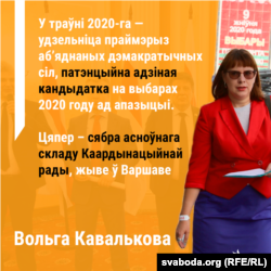 Неўзабаве пасьля выбараў 9 жніўня Вольга Кавалькова ўвайшла ў асноўны склад Каардынацыйнай рады. Была затрыманая на тэрыторыі Нацыянальнага аэрапорта «Менск» падчас спробы выехаць у Польшчу на сустрэчу з прадстаўнікамі польскага ўраду. Асуджаная на 10 сутак. У ноч з 4 на 5 верасьня 2020 году невядомыя вывезьлі Вольгу Кавалькову на памежны пункт пропуску «Брузгі», адкуль яна самастойна дабралася да Варшавы.