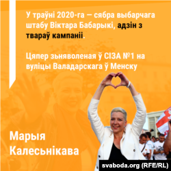 Пасьля арышту самога Бабарыкі яна разам з адвакатам Максімам Знакам фактычна ўзначаліла яго выбарчы штаб. Зь сярэдзіны ліпеня актыўна ўдзельнічала ў працы аб’яднанага штабу, разам са Сьвятланай Ціханоўскай і Веранікай Цапкалай езьдзіла на сустрэчы з выбаршчыкамі па Беларусі. На прэс-канфэрэнцыі 17 ліпеня Марыя Калесьнікава сказала, што гэта яна прапанавала Сьвятлане Ціханоўскай аб’яднаць штабы і працаваць разам.