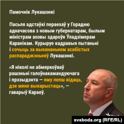 «Кантроль за дзейнасьцю кадраў. Цалкам. Усіх кадраў у галіне, — так вызначыў сам Лукашэнка сфэру адказнасьці Юрыя Караева на новым месцы. — Ад старшыні сельскага савету, кіраўніка прадпрыемства — да губэрнатара».