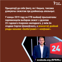Рыгор Азаронак прыцягнуў да сябе ўвагу таксама дзякуючы сюжэтам пра дзейнасьць апазыцыі. У канцы 2019 году на СТВ выйшаў прысьвечаны парлямэнцкім выбарам сюжэт з удзелам 23-гадовага Азаронка-малодшага, у якім ён згадвае Сяргея Ціханоўскага, а апанэнтаў дзейнай улады называе «балбатунамі» і «клоўнамі».