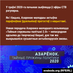 Ужо ў траўні 2020 году Азаронак-малодшы пачынае зьяўляцца ў эфіры СТВ рэгулярна, яго сюжэты прысьвечаны прэзыдэнцкай кампаніі, якая пачынае набіраць абароты. Як і бацька, Азаронак-малодшы актыўна параўноўвае ўдзельнікаў пратэстаў, якія шырацца, з нацыстамі часоў Другой сусьветнай вайны.