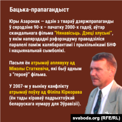 Прозьвішча Азаронак добра вядомае тым, хто глядзеў беларускую тэлевізію у сярэдзіне 1990-х — пачатку 2000-х гадоў. Яно дагэтуль моцна зьвязанае з вобразам беларускай дзяржаўнай прапаганды дзякуючы Юрыю Азаронку, аўтару скандальна вядомага фільма «Нянавісьць. Дзеці хлусьні». Яго паказалі на беларускай тэлевізіі праз год пасьля прыходу на пасаду прэзыдэнта Аляксандра Лукашэнкі, перад рэфэрэндумам аб зьмене сымболікі.