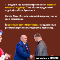 Старэйшыя і больш вядомыя калегі Азаронка-малодшага тым жа ўказам атрымалі меншыя ўзнагароды. Аўтар «СБ» Андрэй Мукавозчык стаў уладальнікам мэдаля «За працоўныя заслугі», а Дзьмітры Крат, рэдактар аддзелу «СБ», які асьвятляе дзейнасьць Лукашэнкі, мэдаля Францішка Скарыны. Узнагароду Азаронку-малодшаму ўручаў асабіста Лукашэнка.