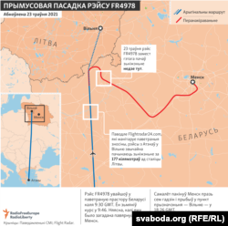 - Пазьней Ryanair заявіла, што атрымала наказ пасадзіць лайнэр у Менску ад беларускіх дыспэтчараў. У прэс-службе Нацыянальнага аэрапорту Менск пацьвердзілі, што пра пагрозу на борце экіпажу Ryanair паведаміла «Белаэранавігацыя».