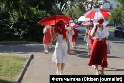 У нядзелю раніцай у цэнтры Менску жанчыны прайшліся з парасонамі колеру беларускага сьцяга. Іх сфатаграфаваў чытач нашага сайту.