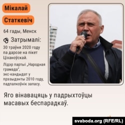 - Іх абвінавачваюць у арганізацыі масавых беспарадкаў, дзеяньняў, якія груба парушаюць грамадзкі парадак, распальваньні сацыяльнай варожасьці ў Беларусі падчас падрыхтоўкі і правядзеньня прэзыдэнцкіх выбараў у 2020 годзе.