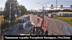 На відэа відаць чырвоны брук на разьдзяляльнай паласе дарогі, дзе знаходзяцца мігранты. Мяркуючы па Google Maps, гэта першыя мэтры тэрыторыі Латвіі акурат за беларускім КПП.