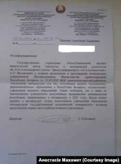 «Інтэрнатура ў мяне павінна была быць у Аляксандрава [Рэспубліканскі навукова-практычны цэнтар анкалёгіі і мэдычнай радыялёгіі імя М.М.Аляксандрава. — РС], якому падпарадкоўваюцца ўсе анколягі Менскай вобласьці, груба кажучы. Лягічна, што яны і рыхтуюць спэцыялістаў для свайго раёну. Але пасьля экзамэнаў я даведалася, што мне не даюць накіраваньня. Мяне выклікалі да дэкана, сказалі, што ў Аляксандрава мяне прыняць ня могуць праз тэхнічныя цяжкасьці».