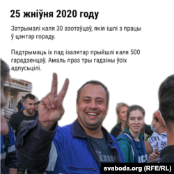 25 жніўня 2020 году затрымалі каля 30 азотаўцаў, якія ішлі з працы ў цэнтар гораду. Падтрымаць іх пад ізалятар прыйшлі каля 500 гарадзенцаў. На месца прыехала кіраўніцтва заводу. Усіх выпусьцілі. На іх склалі пратаколы за ўдзел у «мітынгу». На наступны дзень на завод прыяжджаў «пагаварыць з калектывам» старшыня аблвыканкаму Ўладзімер Каранік. Пасьля азотаўцаў неаднаразова будуць затрымліваць паасобку.