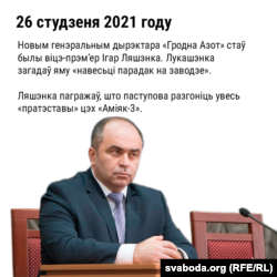 26 студзеня 2021 году памяняўся генэральны дырэктар «Гродна Азот». Месца Ігара Бабыра заняў былы віцэ-прэм’ер Беларусі Ігар Ляшэнка. Лукашэнка загадаў яму «навесьці парадак на заводзе». На прадпрыемстве перад гэтым зьявіўся новы аддзел унутранай бясьпекі, людзі ў цывільным выклікалі работнікаў на гутаркі, уплывалі на рашэньні аб кадрах. Новы дырэктар прымушаў работнікаў падпісваць праўладны ліст супраць санкцый. Таксама ён пагражаў, што паступова разгоніць увесь «пратэставы» цэх «Аміяк-3». Большасьць затрыманых нядаўна азотаўцаў працавалі ў гэтым цэху.