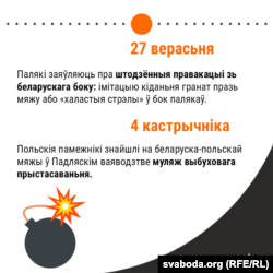 Польскія памежнікі знайшлі на беларуска-польскай мяжы ў Падляскім ваяводзтве муляж выбуховага прыстасаваньня. За некалькі дзён да гэтага паведамлялася, што беларускія памежнікі правакуюць польскіх, кідаючы ў іхны бок прадметы і накіроўваючы зброю.