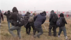 Мігранты зноў масава вярнуліся на праезную частку, дзе знаходзіцца пункт пропуску. Але асобныя іх суайчыньнікі спрабуюць рукамі зьнішчаць калючы дрот на мяжы.