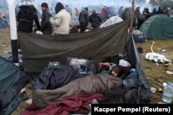 Агенцтва Reuters апублікавала фота побыту мігрантаў на мяжы ў чацьвер, 18 лістапада. Многія працягваюць спаць пад адкрытым небам. Частцы ўдалося трапіць пад дах ангара транспартна-лягістычнага цэнтру, што побач з пунктам пропуску «Брузгі». Але месца хапіла ня ўсім.