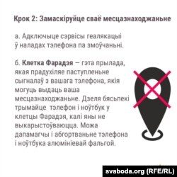 b. Клетка Фарадэя — гэта прылада, якая не прапускае з вашага тэлефона сыгналы, якія могуць выдаць месца вашага знаходжаньня. Раім трымаць ваш тэлефон і ноўтбук у клетцы Фарадэя, калі яны не выкарыстоўваюцца. Можна і абгарнуць тэлефон і ноўтбук алюмініевай фольгай.