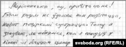 «Маріаннечка, ау, прывітаньне! Гэтым разам не ўдалося нам разьвітацца, нават позіркамі сустрэцца. Таму я згадваю, як абняліся, калі я сыходзіў у ліпені — і быццам цяпер так было.