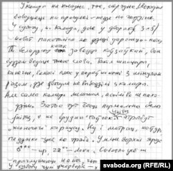 Крыху пра сябе. Справа пакуль як было, а ці што дадасца, ня ведаю. У чацьвер у СК не казалі, а новых сустрэч яшчэ не было, можа, ужо што будзе да Новага году. Ці нават пазьней, загадваць ня будзем. Нармальная камэра, № 89, у гэтак званым „жаночым“ корпусе. Нас (лічба закрэсьлена. — РС) адзін раней знаёмы, калега. Мне ўсе дапамагаюць асвоіцца.