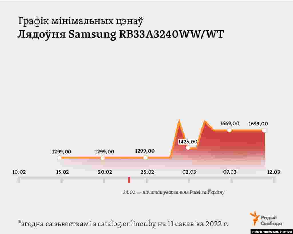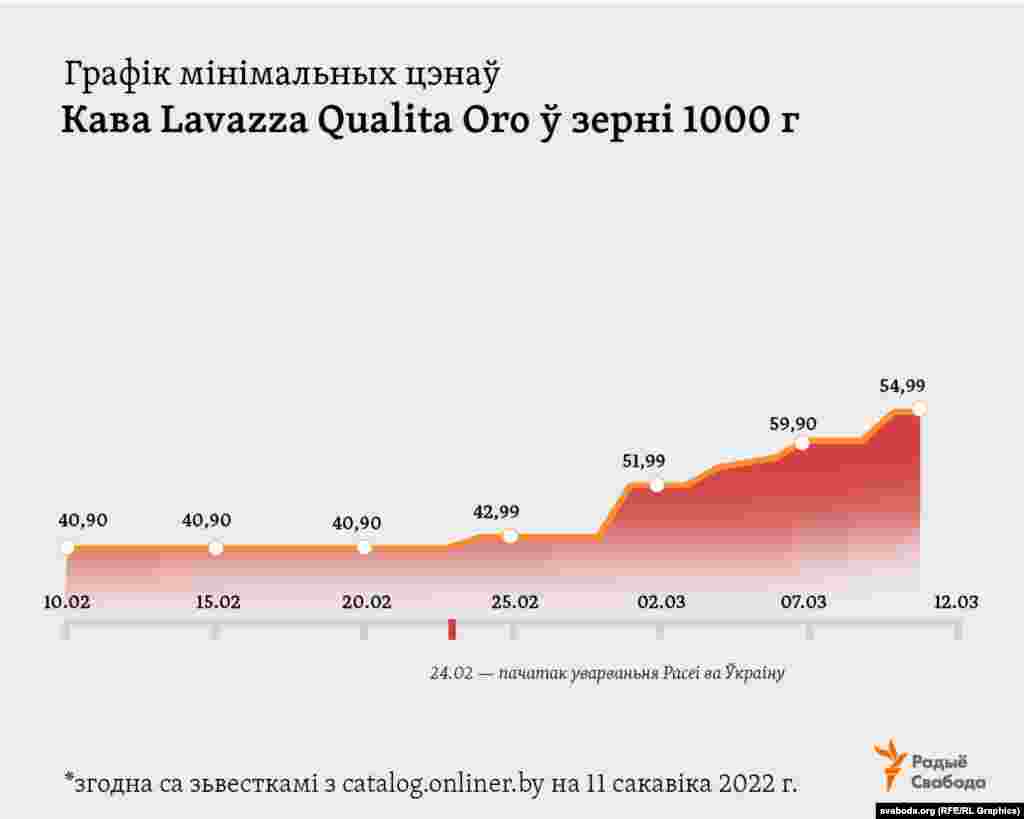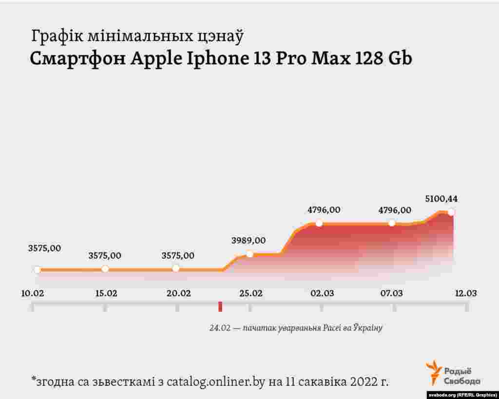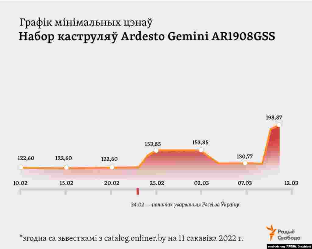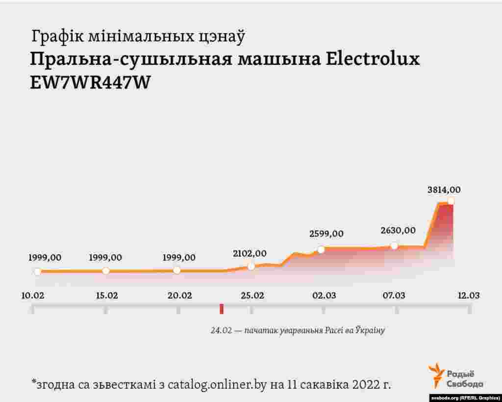 Напад Расеі на Ўкраіну адазваўся рэзкім выбухам цэнаў на ўсе тавары ў Беларусі, асабліва замежнай вытворчасьці. Па ўсім відаць, што гэта яшчэ не канчатковыя цэны, бо даляр не спыняе свайго росту. На графіках вы можаце пабачыць мінімальную цану кожнага з тавараў у залежнасьці ад даты.