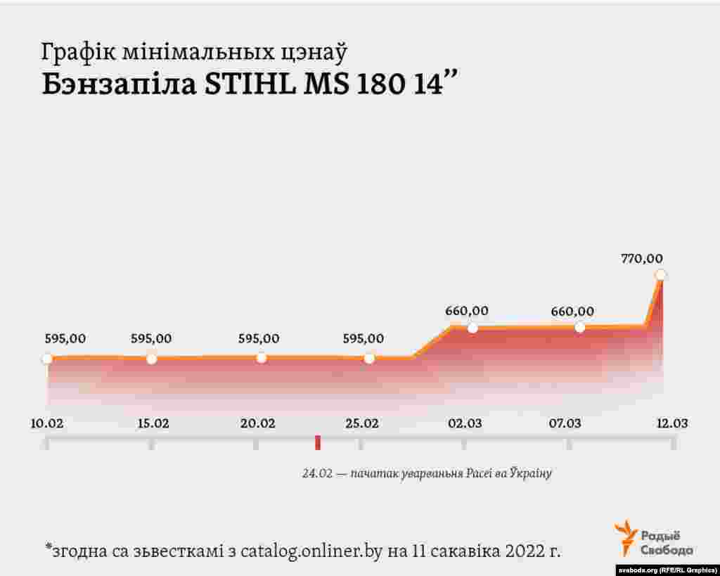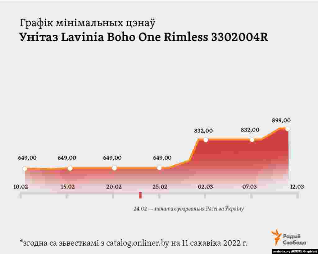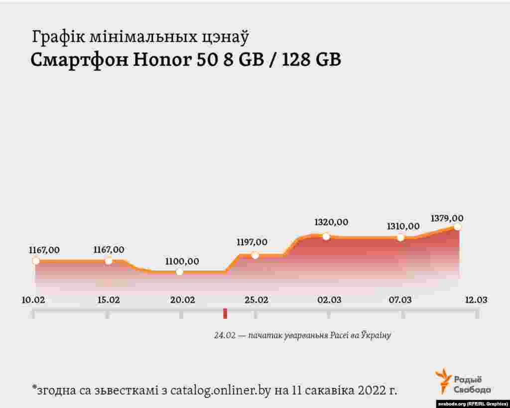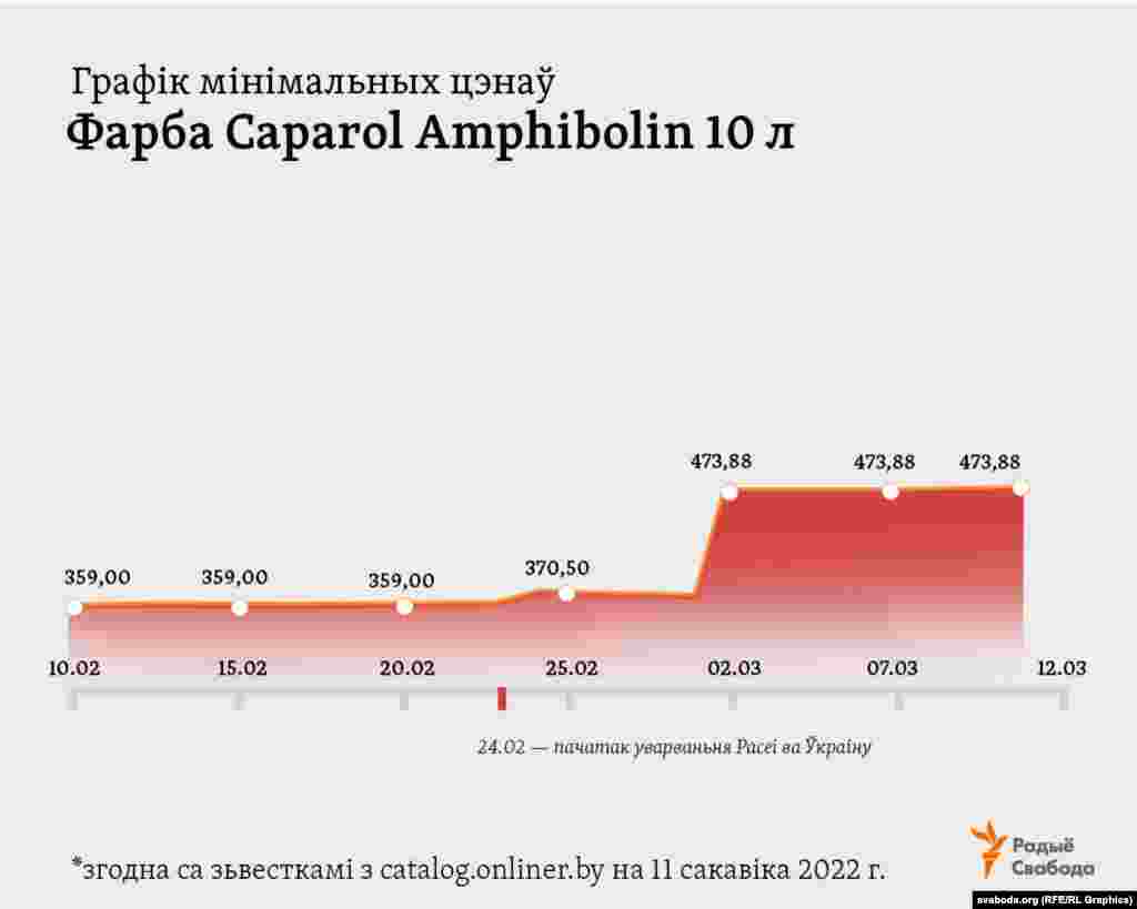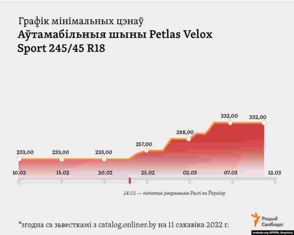 Напад Расеі на Ўкраіну адазваўся рэзкім выбухам цэнаў на ўсе тавары ў Беларусі, асабліва замежнай вытворчасьці. Па ўсім відаць, што гэта яшчэ не канчатковыя цэны, бо даляр не спыняе свайго росту. На графіках вы можаце пабачыць мінімальную цану кожнага з тавараў у залежнасьці ад даты.