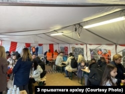 «Уначы, калі няма валянтэраў, на вакзале дзяжураць пажарнікі. Яны таксама пільнуюць нашу кладоўку, каб ніхто нічога адтуль не вынес. Мы ня ўсё з кладоўкі выстаўляем напаказ, бо калі б выставілі, яно хутка прапала б, проста людзі бралі б зашмат і ўмомант усё разабралі б. Таму, калі я бачу жанчыну з малым дзіцём, то пытаю ў яе: „Вам трэба пампэрсы? Трэба сухое малако?“ Тое самае, калі нехта прыходзіць з сабакам: „Ці маеце корм для сабакі?“ Бо ў нас ёсьць, толькі ён схаваны пад сталом».