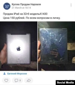 У розных суполках «УКантакце» Нароўлі і Мазыра прысутнасьць расейскіх вайскоўцаў ня надта адчуваецца. У суполцы «Куплю Продам Наровля» былі разьмешчаны абвесткі пра продаж iPad за 150 рублёў і новага мабільнага тэлефона, пра цану якога не паведамляецца. Адзін з прадаўцоў — нібыта «жыхар гораду Энэргадару», у другога профіль прыватны, але на аватарцы — вайскоўцы і танкі.