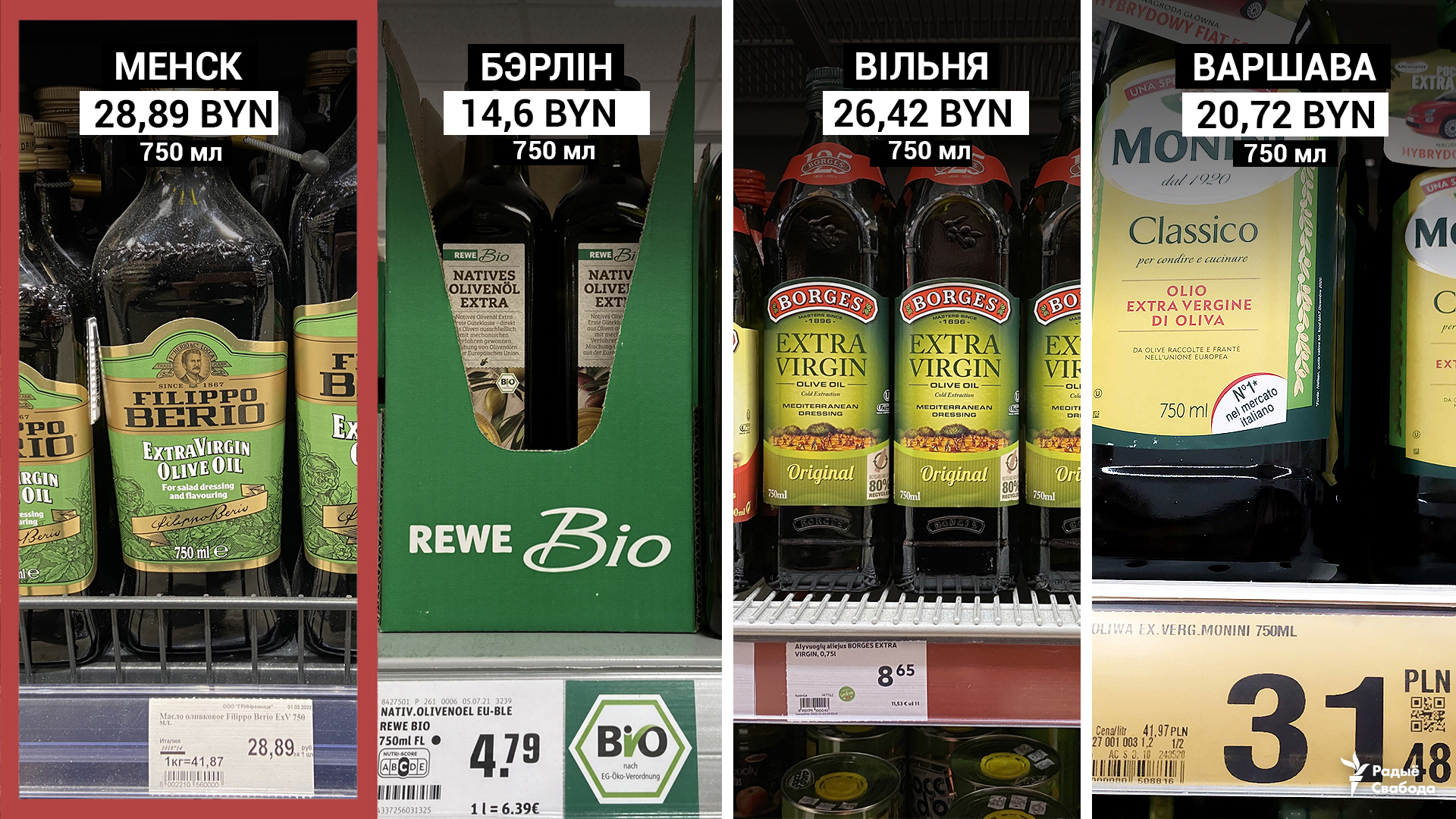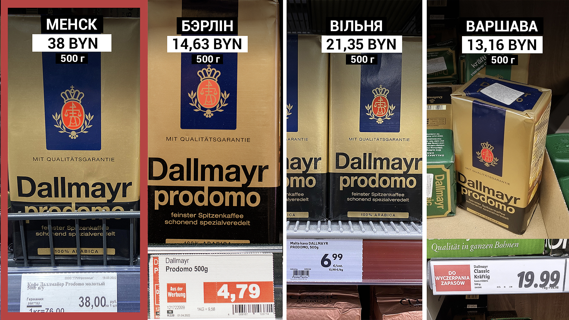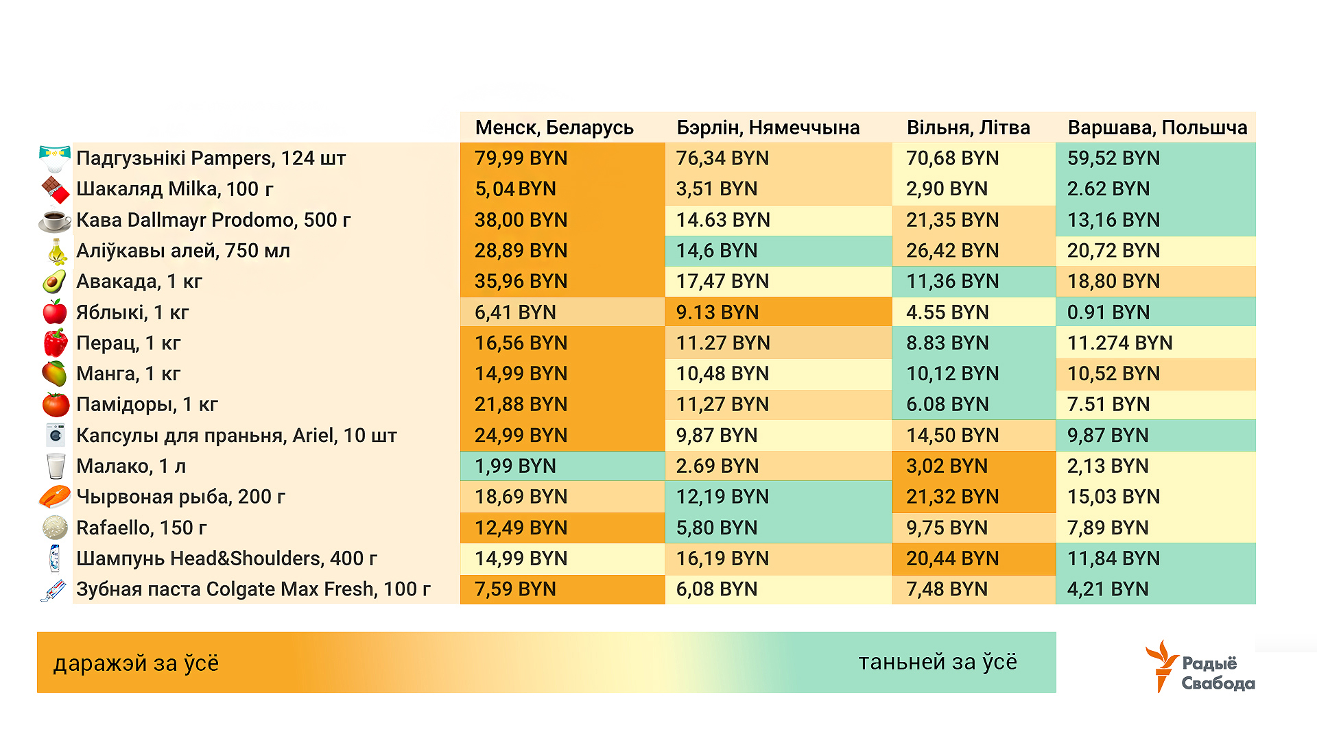 Аказалася, што, амаль усе абраныя тавары даражэйшыя ў Беларусі. Сярод такіх — дзіцячыя падгузьнікі, шакаляд, кава молатая, аліўкавы алей, памідоры, авакада, перац салодкі, капсулы для пральнай машыны, какосавыя цукеркі. Прычым некаторыя пазыцыі ў Беларусі даражэйшыя ў разы: так, паўкіляграмовы пачак кавы ў менскім гіпэрмаркеце каштуе 38 рублёў, у Вільні — 21, а ў Варшаве і Бэрліне — менш за 15. Авакада ў Менску каштуе амаль 36 рублёў, у Варшаве і Бэрліне — удвая менш, каля 18 рублёў, а ў Вільні на зьніжцы ўвогуле каля 11 з паловай рублёў.