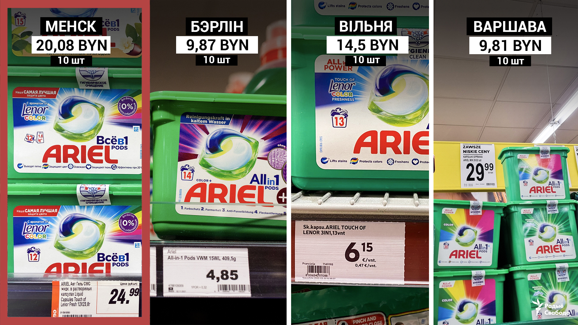 Мы параўналі цэны на некалькі спажывецкіх і харчовых тавараў у Менску, Вільні, Бэрліне і Варшаве.