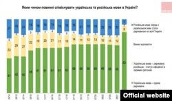 Аднак у пытаньні статусу моваў карціна іншая. У 2014 годзе доля прыхільнікаў адзінай дзяржаўнай мовы — украінскай — прыблізна супадала з доляй тых, у каго ўкраінская была адзінай мовай хатняга ўжытку. Пасьля 2014 году доля прыхільнікаў адзінай дзяржаўнай мовы істотна, на 20 адсоткавых пунктаў, павялічылася, падчас вайны адбыўся яшчэ адзін скачок колькасьці прыхільнікаў такога афіцыйнага статусу моваў.