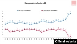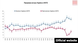 Падчас вайны таксама павялічыліся долі тых, хто выступае за сяброўства Ўкраіны ў Эўразьвязе і NATO. Аднак вынікам нежаданьня Паўночнаатлянтычнага альянсу ўступіць у вайну на баку Ўкраіны і заяваў прэзыдэнта Зяленскага пра гатоўнасьць адмовіцца ад імкненьня да ўступленьня ў Альянс стала пэўнае зьніжэньне долі прыхільнікаў сяброўства Ўкраіны ў NATO. Але, тым ня менш, доля прыхільнікаў гэтага застаецца вышэйшай, чым была да пачатку вайны.