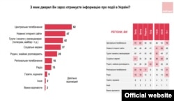 Структура інфармацыйнага спажываньня ва Ўкраіне парадаксальным чынам падобная да беларускай. Найбольш папулярная крыніца — тэлевізія, прыкладна роўная зь ёю — інтэрнэт-сайты, крыху менш папулярныя сацыяльныя сеткі. Гэтак жа, як і ў Беларусі, тэлевізія пераважае як крыніца інфармацыі сярод старэйшага пакаленьня, моладзь аддае перавагу інтэрнэту, а яшчэ больш — мэсэнджарам. Праўда, у Беларусі мэсыджы тэлевізіі і найбольш папулярных інтэрнэт-сайтаў і мэсэнджараў — ці не супрацьлеглыя. Ва Ўкраіне карціна зусім іншая.