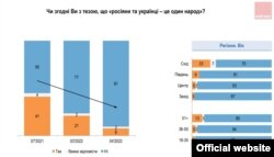 Летась Уладзімір Пуцін апублікаваў артыкул, у якім абгрунтоўваў, што расейцы і ўкраінцы — адзін народ. Тую ж тэзу ён паўтарыў у сваім выступе 21 лютага сёлета аб прызнаньні незалежнасьці «ДНР» і «ЛНР». Летась немалая частка ўкраінцаў гэтую тэзу падзяляла, хоць, магчыма, і зь іншай, чым у Пуціна, інтэрпрэтацыяй. Але пасьля пачатку вайны доля прыхільнікаў такога ўяўленьня скарацілася ў 5 разоў.