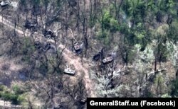 Падбітая тэхніка расейскай арміі пасьля нападаў Узброеных сіл Украіны на беразе ракі Северскі Данец каля вёскі Белагораўка на Данбасе. Фота апублікаваў 12 траўня 2022 году Генэральны штаб Узброеных сіл Украіны