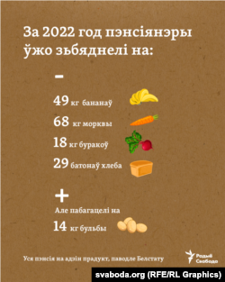 Пры гэтым, у параўнаньні са сьнежнем, цяпер пэнсіянэр можа набыць на ўсю пэнсію больш бульбы — на 14 кіляграмаў.