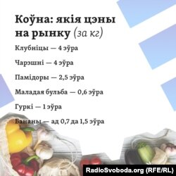 «На кірмашы куплялі вельмі клясныя малінавыя памідоры, ня ведаю адкуль яны, раней бы сказаў, што дакладна Херсон, яны каштавалі 2,5 эўра. Нядаўна рабілі маласольныя гуркі, у сэзон яны танныя: дзесьці па 1 эўра за кіляграм».