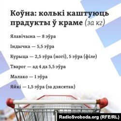 Дзьмітрый расказвае, што літар малака бярэ за 1 эўра. Тварог, калі па зьніжках, то 4 эўра за кіляграм, бязь зьніжак — 5,5 эўра. Дзясятак яек можа каштаваць і 1 эўра, і 3. Сярэдняя цана — дзесьці 1,5 эўра.