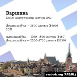Год таму «кавалерка» (так у Польшчы называюць кватэру-студыю, дзе пакой сумешчаны з кухняй) у Варшаве памерам 19–20 «квадратаў» каштавала 1700–1800 злотых ($450), двухпакаёўка — 2500–2700 ($650) злотых. Цяпер нармальную двухпакаёўку можна знайсьці за 3500 злотых ($900).