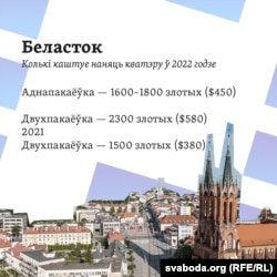 Цяпер ня вельмі дагледжаная кватэра ў Беластоку або вельмі малая будзе каштаваць 1600–1800 злотых без камунальных. З рамонтам, больш акуратная двухпакаёўка — 2300 злотых. „Кавалерка“ з добрым рамонтам можа каштаваць 2000 злотых. Год таму „двушку“ можна было знайсьці за 1500 злотых. Як прыехалі ўкраінцы, кошты пайшлі ўверх.