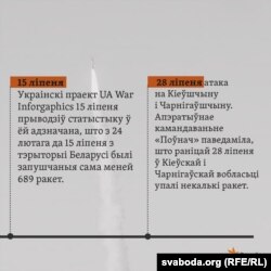 Украінскі праект UA War Inforgaphics 15 ліпеня прыводзіў статыстыку ў сама меней 689 ракет, запушчаных з тэрыторыі Беларусі. Гэтую ж статыстыку затым давалі некаторыя ўкраінскія СМІ.