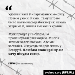 «За што? За тое, што я жыву на сваёй радзіме? Наогул я ня бачу расколу паміж беларусамі, якія зьехалі і якія засталіся. Наадварот, бачу, што людзі пішуць, што тыя, хто застаўся, — сапраўдныя героі. Ёсьць непаразуменьні, але я больш разуменьня бачу паміж намі», — кажа Ганна.
