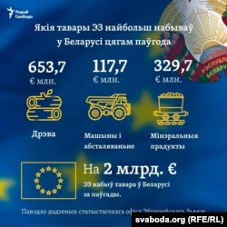Больш за 2 мільярды эўра — на такую суму Беларусь прадала тавараў у ЭЗ за паўгода: са студзеня па чэрвень, вынікае з дадзеных статыстычнага офіса Эўрапейскага Зьвязу, якія атрымала Радыё Свабода.