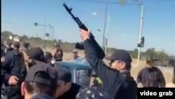 На відэа відаць, як паліцыя страляе ў паветра, спрабуючы разагнаць пратэстоўцаў, але тыя не разыходзяцца.