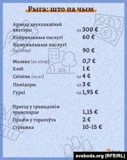 «Малако ў нас польскае Farm Milk, таму яно таннае — 0,85 цэнта. Гэта самы танны варыянт, мясцовае даражэйшае. Хлеб — 1 эўра, але ёсьць розныя варыянты. Мяса падаражэла, на самых вялікіх зьніжках можна набыць за 4 эўра кіляграм сьвініны. Гуркі — 1,95 за кіляграм, памідоры — 2,99 эўра. Цэны мяняюцца штодня, у мяне недалёка дзьве крамы Maxima, дык нават там цэны розьняцца».