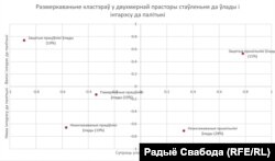 На графіку, які прыводзіцца ніжэй, пазначаныя сярэдзіны, цэнтры кластэраў, сярэднія значэньні адпаведных паказьнікаў у дзьвюхмернай прасторы.