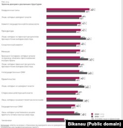 - Зацятыя прыхільнікі (9%) — вельмі давяраюць дзяржаўным структурам і не давяраюць недзяржаўным інстытутам.
