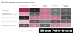 У дасьледаваньні былі вызначаныя 5 групаў апытаных, якія істотна адрозьніваюцца адна ад адной паводле стаўленьня да нацыянальных каштоўнасьцяў. Гэта «Сьвядомыя» (14%), «Савецкія» (29%), «Тыя, хто фармуецца» (39%), «Абыякавыя» (13%) і «Русыфікаваныя» (4%).
