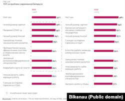 Найбольш актуальнымі праблемамі па-ранейшаму застаюцца эканамічныя: рост коштаў, нізкія заробкі і пэнсіі, што ў цэлым вельмі характэрна для беларускага грамадзтва ў розных замерах. Тым ня менш, у ТОП-5 праблемаў таксама ўвайшлі палітычныя праблемы, такія як вайна Расеі з Украінай (87%) і санкцыі з боку ЭЗ і ЗША (занепакоенасьць якімі ў цэлым не зьмянілася). Іншымі словамі, гараджане добра разумеюць актуальнасьць праблемы вайны для Беларусі і, імаверна, адчуваюць яе блізкасьць за кошт удзелу «братэрскіх» для Беларусі суседніх краінаў і ролі самой Беларусі ў гэтым канфлікце.