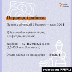 Нармальным заробкам у Аўстраліі, паводле ацэнкі суразмоўцы, лічыцца вышэйшы за $40 тысяч за год. Аднак добры — гэта вышэйшы за $65 тысяч, а некаторыя зарабляюць і па $165 тысяч. Найбольш можна зарабіць, калі працаваць у шахтах. Распаўсюджаны вахтавы мэтад працы, калі людзі лятаюць туды на два тыдні, а потым вяртаюцца дадому. Так можна хутка зарабіць добрыя грошы, «хоць гэта і разбуральна для сям’і», дадае беларуска. Добры заробак маюць прафэсары ва ўнівэрсытэце, айцішнікі таксама маюць попыт у Аўстраліі.