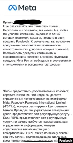 «Выдаліць дадзеныя з Facebook Pay проста немагчыма, на жаль. Як толькі сілавік атрымлівае доступ да вашага Facebook Pay, то далей ужо няма куды адпірацца. Намі былі праведзеныя размовы з Facebook (уладальнікам сацсеткі зьяўляецца кампанія Meta. — РС). На сёньняшні дзень адзін з двух вялікіх фандрайзінгаў выдалены. Той, які быў на BySol. Па другім ідуць перамовы. Facebook — гэта вялізная транснацыянальная карпарацыя са сваімі падыходамі, там вельмі складана прабіцца да кіраўніцтва».
