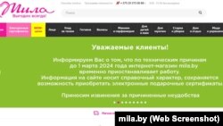 «Паважаныя кліенты! Інфармуем вас аб тым, што з тэхнічных прычынаў да 1 сакавіка 2024 году інтэрнэт-крама mila.by часова прыпыняе працу. Інфармацыя на сайце носіць даведачны характар, захоўваецца магчымасьць набываць электронныя падарункавыя сэртыфікаты», — паведамляе рытэйлер.