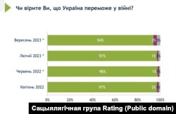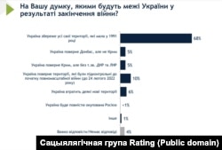 У верасьнёўскім 2023 году апытаньні Rating большасьць рэспандэнтаў (68%) выказвалі ўпэўненасьць, што ў выніку заканчэньня вайны Ўкраіна захавае ўсе тэрыторыі, якія мела ў 1991 годзе.